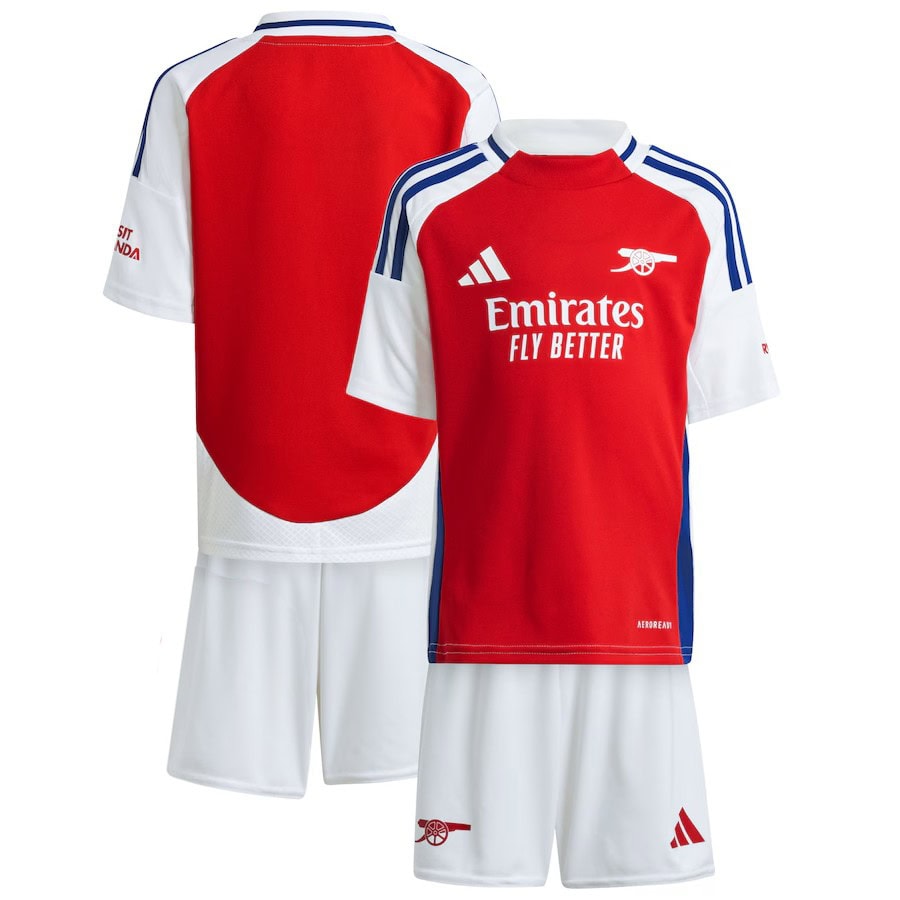 חולצת הבית של ארסנל לעונת 2024-2025, שעוצבה על ידי אדידס, משלבת את הצבע האדום הקלאסי של המועדון עם אלמנטים לבנים ופסים כחולים בצדדים, כחלק מתבנית העיצוב החדשה של אדידס. החולצה כוללת את סמל התותח האייקוני של המועדון, המופיע לראשונה מאז עונת 1989-1990. חליפת הילדים כוללת מכנסיים לבנים עם פסים כחולים.