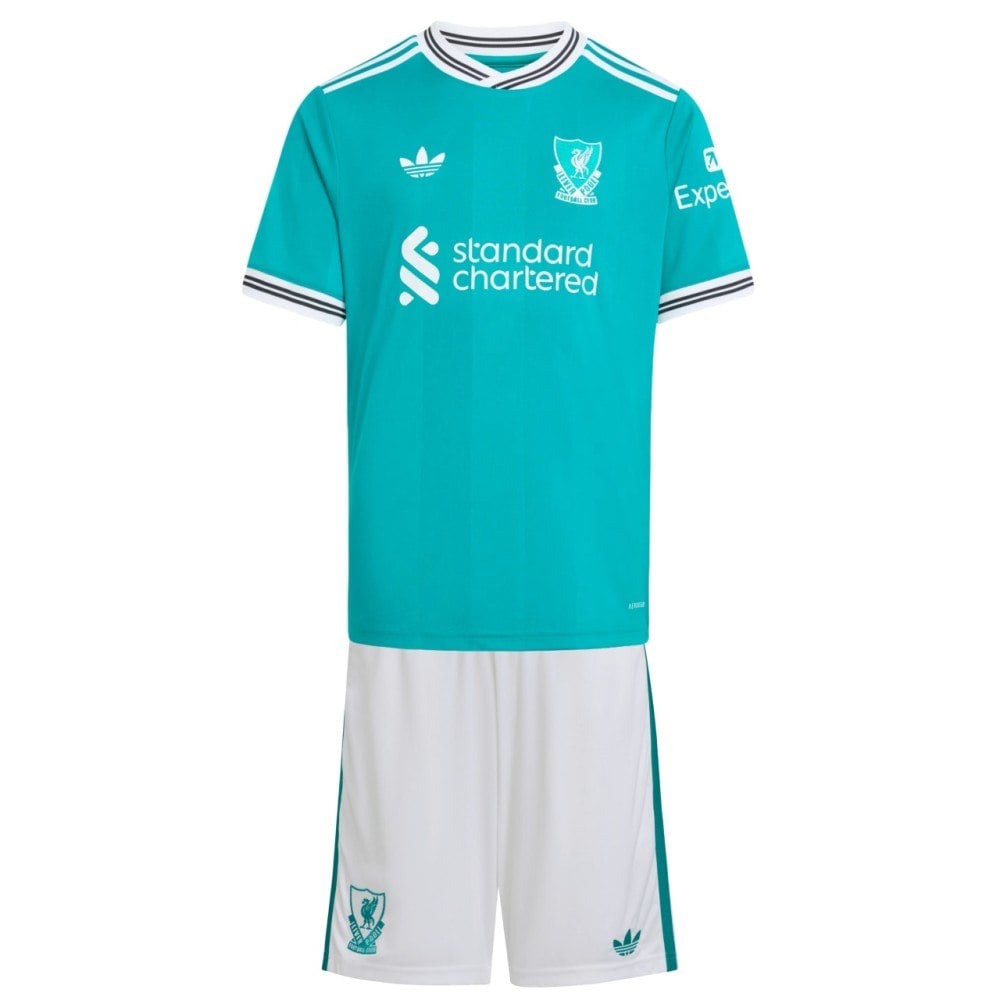 "description": "חליפת ילדים ליברפול שלישית 25-26 בגוון Sea Green עם Trefoil וסמל מעודכן בהשראת שנות ה-90.",