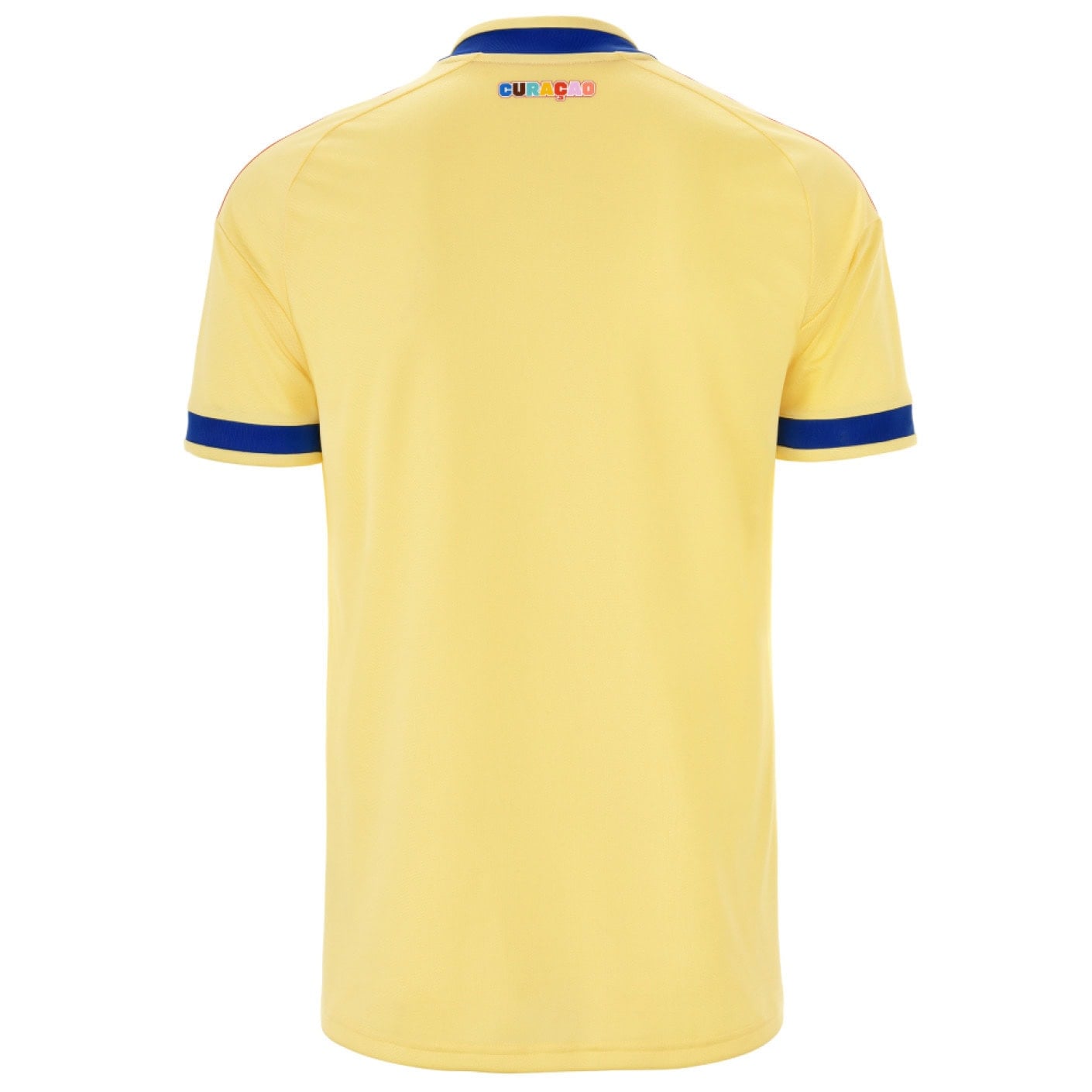 הדגם בנוי על גוון בסיס בהיר מאוד, שמתואר כ"כמעט צהוב", עם פרטים בכחול מלכותי שמכניסים עומק וחדות לעיצוב. שלושת הפסים מגיעים בצבעי הטריקולור, כך שגם בלי להעמיס יותר מדי אלמנטים, החולצה מרגישה מחוברת מאוד לזהות של קוראסאו ולצבעוניות שמזוהה עם האי. התוצאה היא חולצת חוץ שנראית רעננה, קיצית ומלאת אנרגיה, אבל גם מסודרת וחזקה מספיק כדי לעבוד מצוין כחולצת משחק וכחולצת אוהדים.