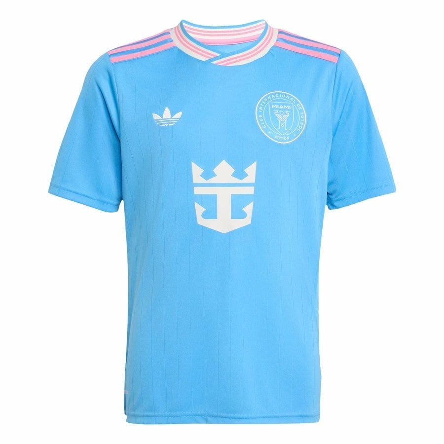 החולצה השלישית של אינטר מיאמי לעונת 2025 מגיעה בגוון תכלת בוהק בשם Semi Blue Burst. הגזרה כוללת פסים אנכיים דקים בטון שקט יותר, שיוצרים עומק חזותי ועדינות גרפית. השרוולים והצווארון בגוון לבן נקי, עם נגיעה ורודה דקה שמחברת לעיצוב המסורתי של המועדון. סמל אינטר מיאמי ולוגו אדידס מופיעים בלבן על החזה, כשהספונסר הראשי מוצג בצורה מאוזנת במרכז.