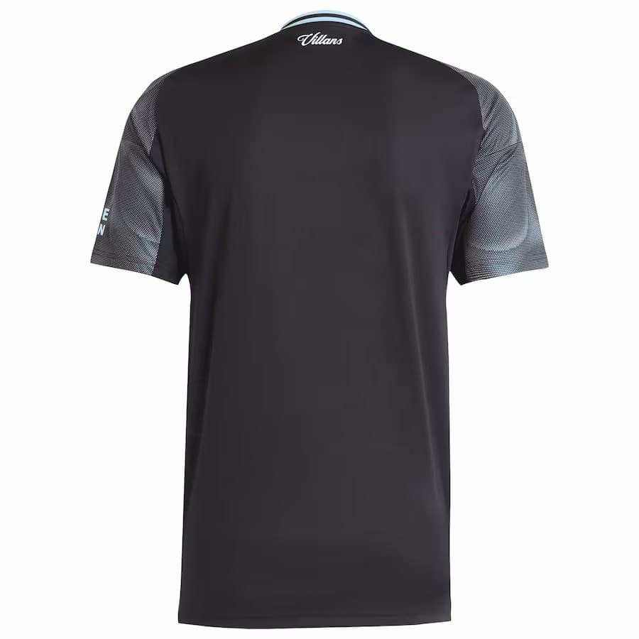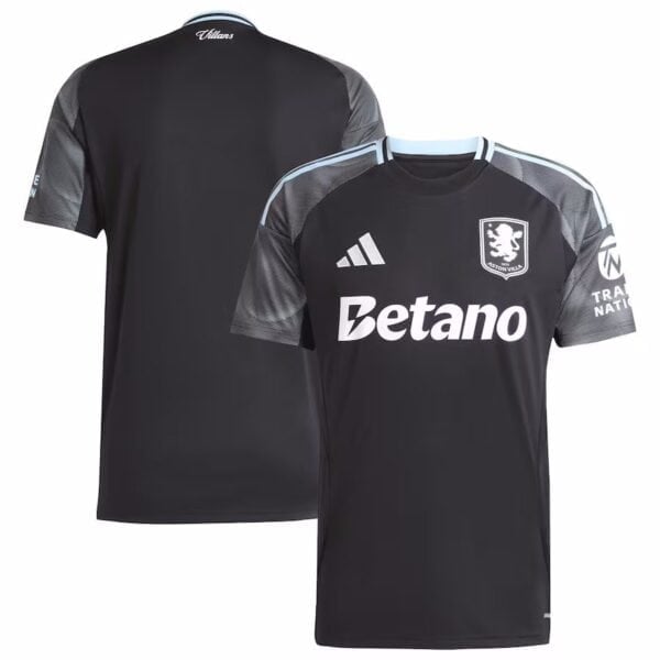 חולצת החוץ של אסטון וילה לעונת 2025/26, בעיצוב של Adidas, מציגה עיצוב אלגנטי בצבע שחור עם נגיעות של כחול-אפור בהיר. הלוגואים של Adidas, הספונסר Betano וסמל המועדון מופיעים בגוון כסוף-אפור מונוכרומטי, מה שמעניק לחולצה מראה מודרני ונקי.