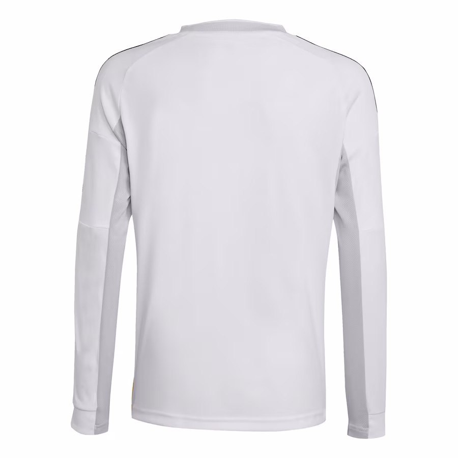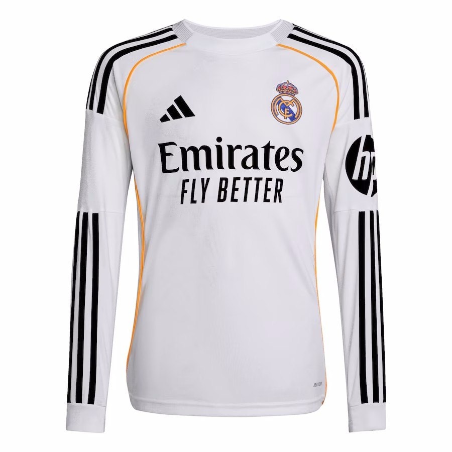 חולצת הבית של ריאל מדריד לעונת 2025/26, בעיצוב של Adidas, מציגה שילוב מרשים של אלגנטיות ומודרניות. החולצה בצבע לבן קלאסי, עם פסים שחורים על הכתפיים, קווים צהובים דקים בצידי החולצה ואלמנטים בגוון אפור בהיר. לוגו המועדון רקום בצד שמאל של החזה, ולוגו Adidas בצד ימין. הספונסרים, "Emirates" בחזית ו-HP על השרוול, מופיעים בצבע חום, מה שמוסיף נופך יוקרתי לעיצוב. החולצה עשויה מבד AEROREADY של Adidas, המסייע בנידוף זיעה ושמירה על נוחות מרבית במהלך המשחק.