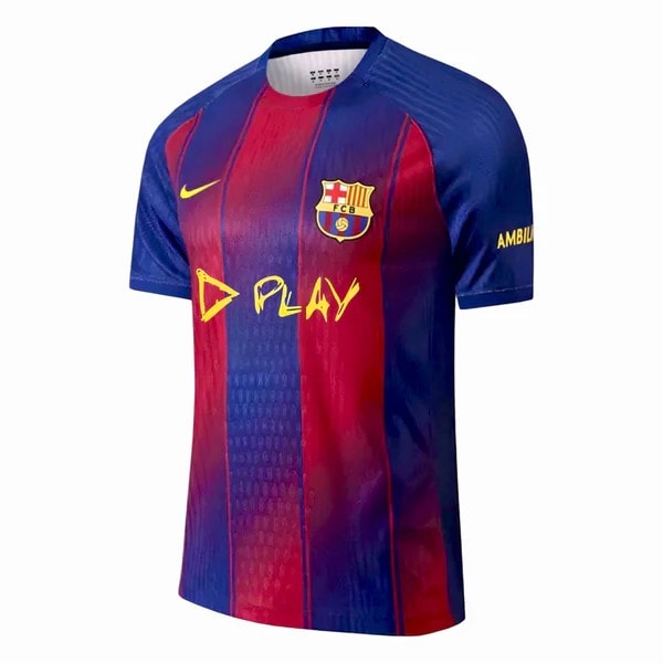חולצת הכדורגל של ברצלונה שומרת על פסי הבלוגרנה של דגם הבית 25/26, ומוסיפה במרכז את לוגו “Play” בגוון צהוב ידידותי לעדשה. שילוב הקולאב מדגיש את החיבור בין מוזיקה וכדורגל, והגזרה הקלילה-נושמת מתאימה למשחק וליום-יום. הסט המשלים כולל מכנסיים וגרביים תואמים לדגם הבית.