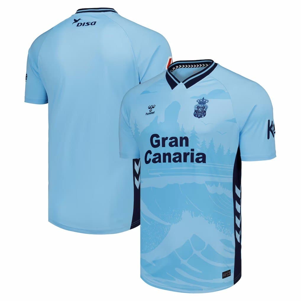 לאס פלמאס מציגה את חולצת החוץ לעונת 2025-26 בגוון תכלת בהיר במחווה למרינו, אחד ממועדוני היסוד. החזית כוללת גרפיקה טונלית של גלי הים ותוואי נוף מקומי, למראה ייחודי ואלגנטי.