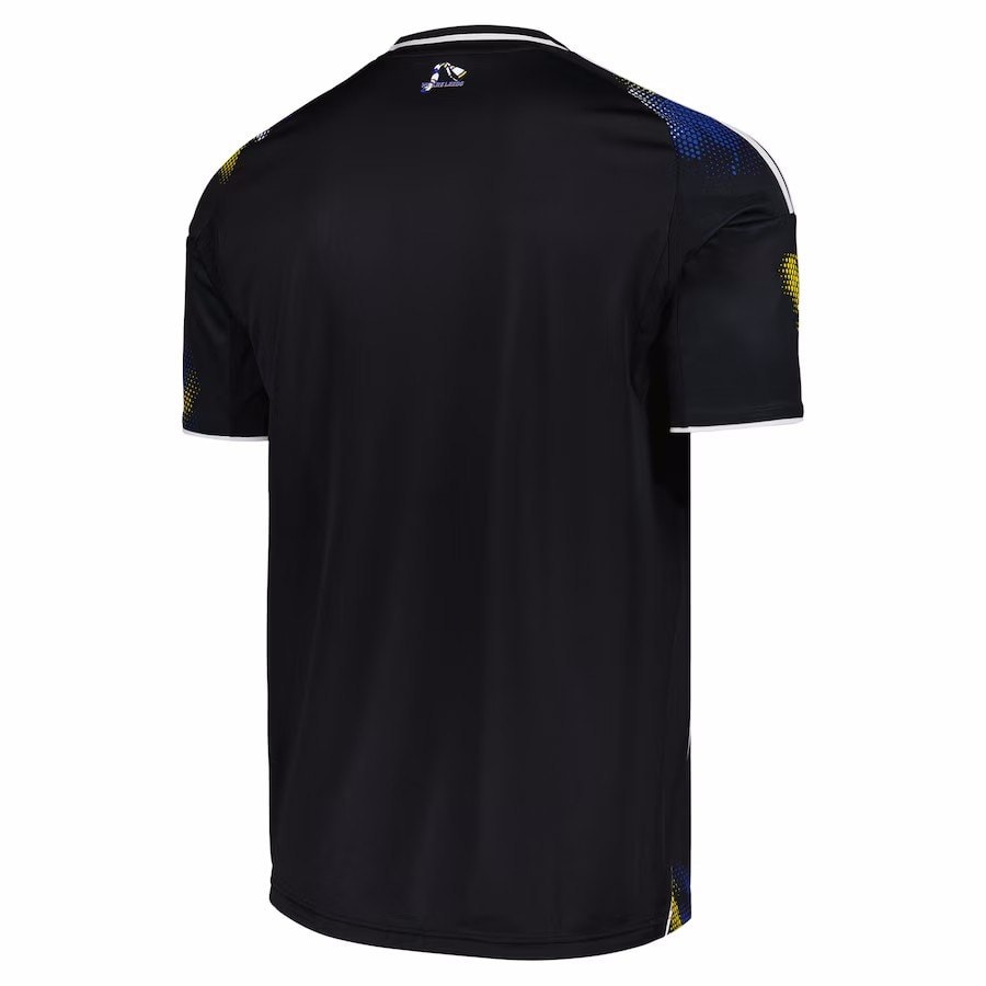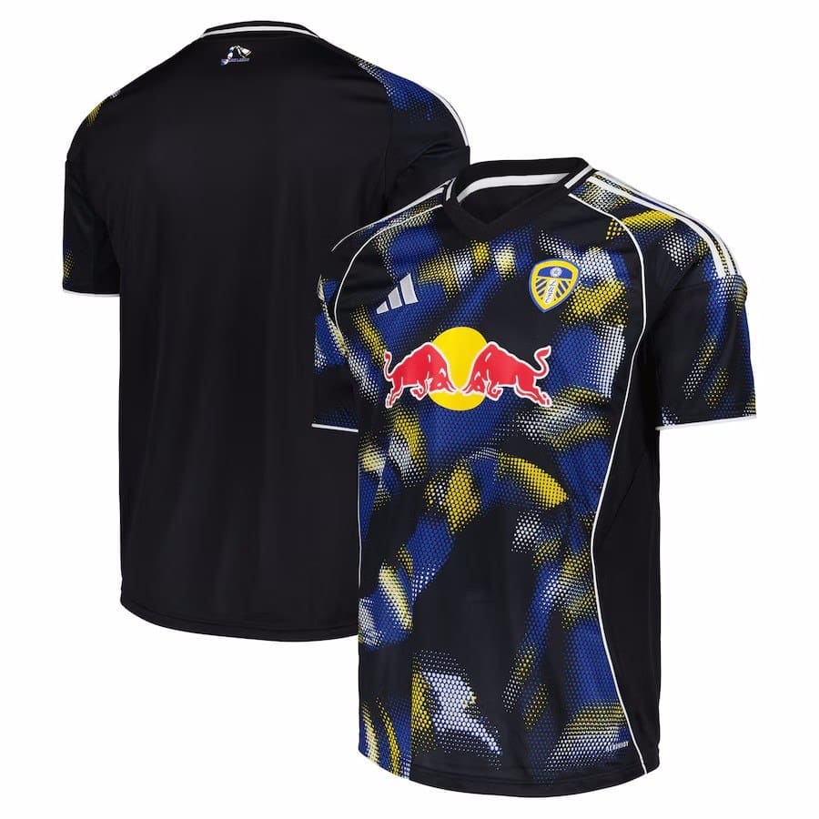 החולצה השלישית של לידס לעונת 25-26 מגיעה על בסיס כהה עם גרפיקה עוצמתית בכחול ובצהוב שמדמה ים של צעיפים מסתובבים ביציעים של אלנד רואד. זהו מראה אנרגטי שמחבר את תרבות האוהדים לעיצוב מודרני חד.