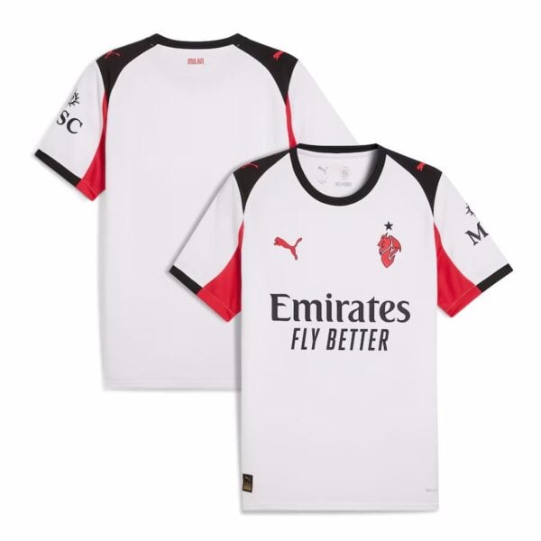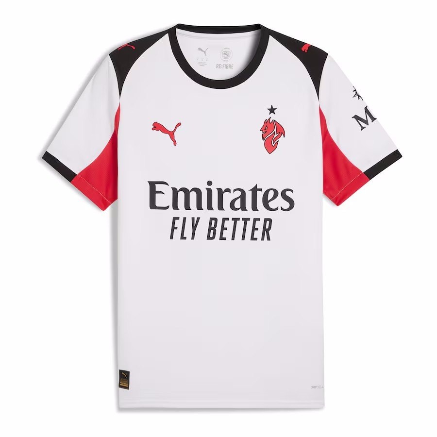 חולצת החוץ החדשה של מילאן לשנת 25-26 מגיעה בצבע בסיס של לבן קלאסי, המשולב עם אלמנטים גרפיים בצבעים כחול כהה (Dark Blue). הדפוס הגרפי בחולצה, כפי שנראה בטלאי הצוואר ובפרטים נוספים, מציג קווים עדינים ומפותלים היוצרים אפקט ויזואלי ייחודי ואלגנטי, אולי כרמז למסלולי הנחלים או אלמנטים ארכיטקטוניים מודרניים של מילאנו. חולצה איכותית זו של מילאן, מבית פומה (Puma), עוצבה עם מחשבה על נוחות מקסימלית וביצועים גבוהים. סמל המועדון ולוגו Puma ממוקמים בחזית באופן בולט, והחולצה מיועדת לספק אוורור אופטימלי ונידוף זיעה יעיל. חולצת כדורגל איכותית זו של מילאן משלימה את סט המדים של הקבוצה לעונה, והיא אידיאלית למגרש, ליציע או ללבוש יומיומי.
