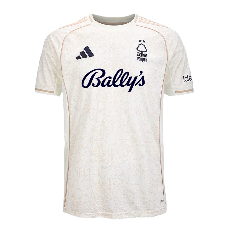 נוטינגהאם פורסט מציגה את חולצת החוץ לעונת 2025-26 בגוון לבן שבור (אוף־וייט) עם דוגמה עדינה בהשראת תעשיית התחרה ההיסטורית של נוטינגהאם ולוגואים בכחול כהה – שילוב אלגנטי ומקומי שמספר סיפור.