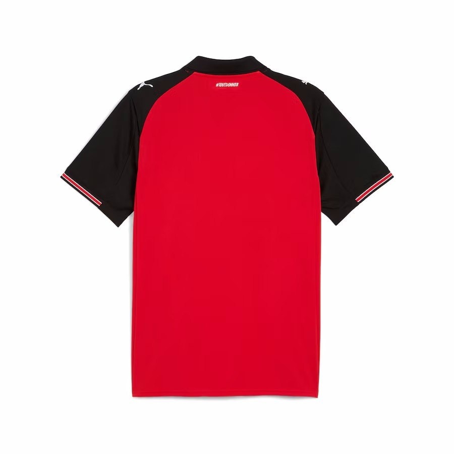 חולצת הבית של סטאד רן לעונת 2025/26, בעיצוב של Puma, מציגה עיצוב קלאסי עם טוויסט מודרני. החולצה בצבע אדום עם שרוולים וצווארון שחורים בסגנון רגלן, המעניקים לה מראה אלגנטי ודינמי. השרוולים מעוטרים בפסי קצה אדומים-לבנים עדינים, המוסיפים נגיעה של תחכום לעיצוב הכולל.