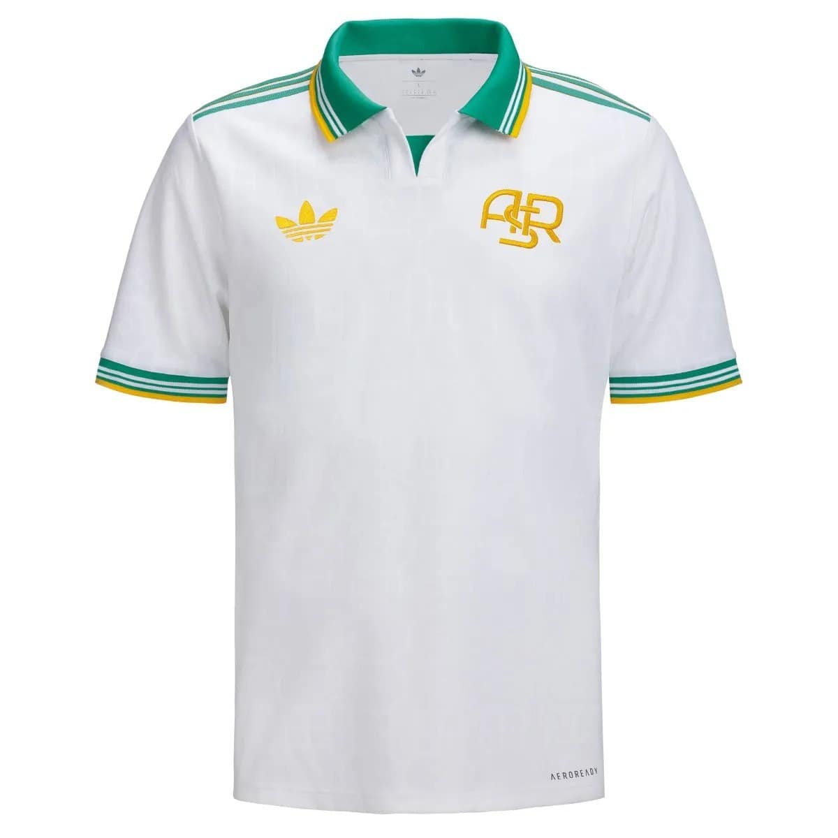 חולצת החוץ השלישית החדשה של א.ס. רומא לשנת 2025/26 מציגה עיצוב נקי על בסיס לבן, עם נגיעות של ירוק וצהוב וצווארון פולו אלגנטי. חולצה איכותית זו של א.ס. רומא, עוצבה לנוחות וביצועים מרביים. לוגו ה-Trefoil האייקוני של אדידס וסמל המועדון הקלאסי (ASR) בצהוב ממוקמים בחזית. התלבושת המלאה כוללת מכנסיים וגרביים בצבע כחול נייבי, המשלימים מראה ייחודי ומתוחכם. חולצת כדורגל איכותית זו של א.ס. רומא אידיאלית למגרש, לאימונים או ללבוש יומיומי.
