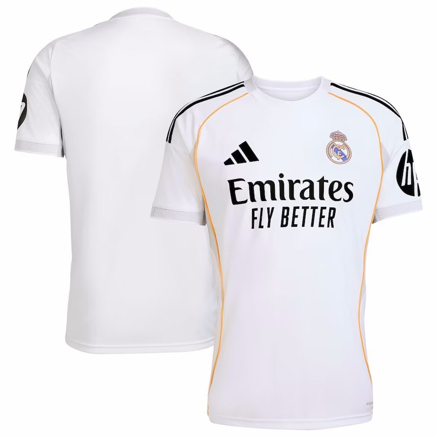 חולצת הבית של ריאל מדריד לעונת 2025/26, בעיצוב של Adidas, מציגה שילוב מרשים של אלגנטיות ומודרניות. החולצה בצבע לבן קלאסי, עם פסים שחורים על הכתפיים, קווים צהובים דקים בצידי החולצה ואלמנטים בגוון אפור בהיר. לוגו המועדון רקום בצד שמאל של החזה, ולוגו Adidas בצד ימין. הספונסרים, "Emirates" בחזית ו-HP על השרוול, מופיעים בצבע חום, מה שמוסיף נופך יוקרתי לעיצוב. החולצה עשויה מבד AEROREADY של Adidas, המסייע בנידוף זיעה ושמירה על נוחות מרבית במהלך המשחק.