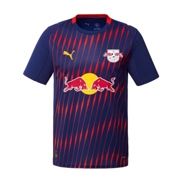 חולצת החוץ של RB Leipzig לעונת 2025/26 מבית Puma מגיעה בבסיס כהה – כחול נייבי עמוק – שעליו מופיעות פסים אלכסוניים בעוצמה של אדום זוהר שמוסיפים תחושת תנועה ודינמיות. על החזה מוצגים לוגו Puma וסמל הקבוצה בגירסה הרגילה, וקולר עגול המשלים את המראה המודרני. החולצה זמינה גם בגירסת סטדיום ובנויה מחומרי ביצועים מנדפים – כוללת גרסת פרימיום שמוצעת למכירה מראש בחנות הרשמית.