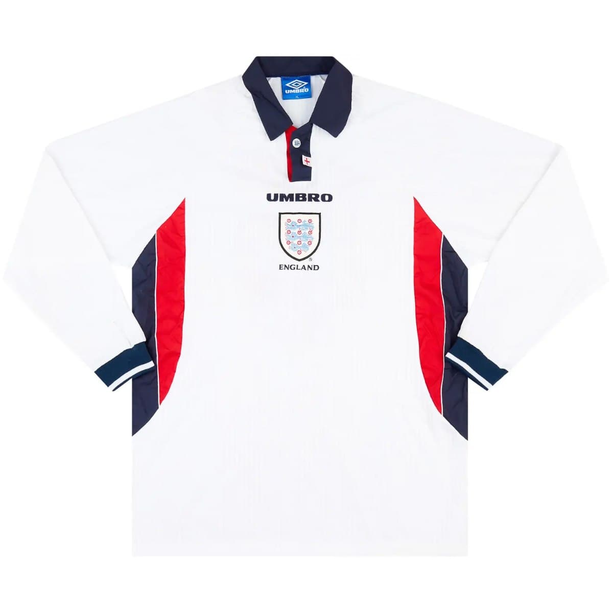 חולצת הבית של אנגליה מ-1998 מגיעה במראה חלק ונקי עם שילוב צבעים קלאסי של לבן, אדום וכחול כהה. אחד הסימנים המזוהים שלה הוא הצווארון המכופתר שמוסיף טאץ’ רטרו אלגנטי, יחד עם סמל נבחרת רקום בחזה שמדגיש איכות וגאווה לאומית.