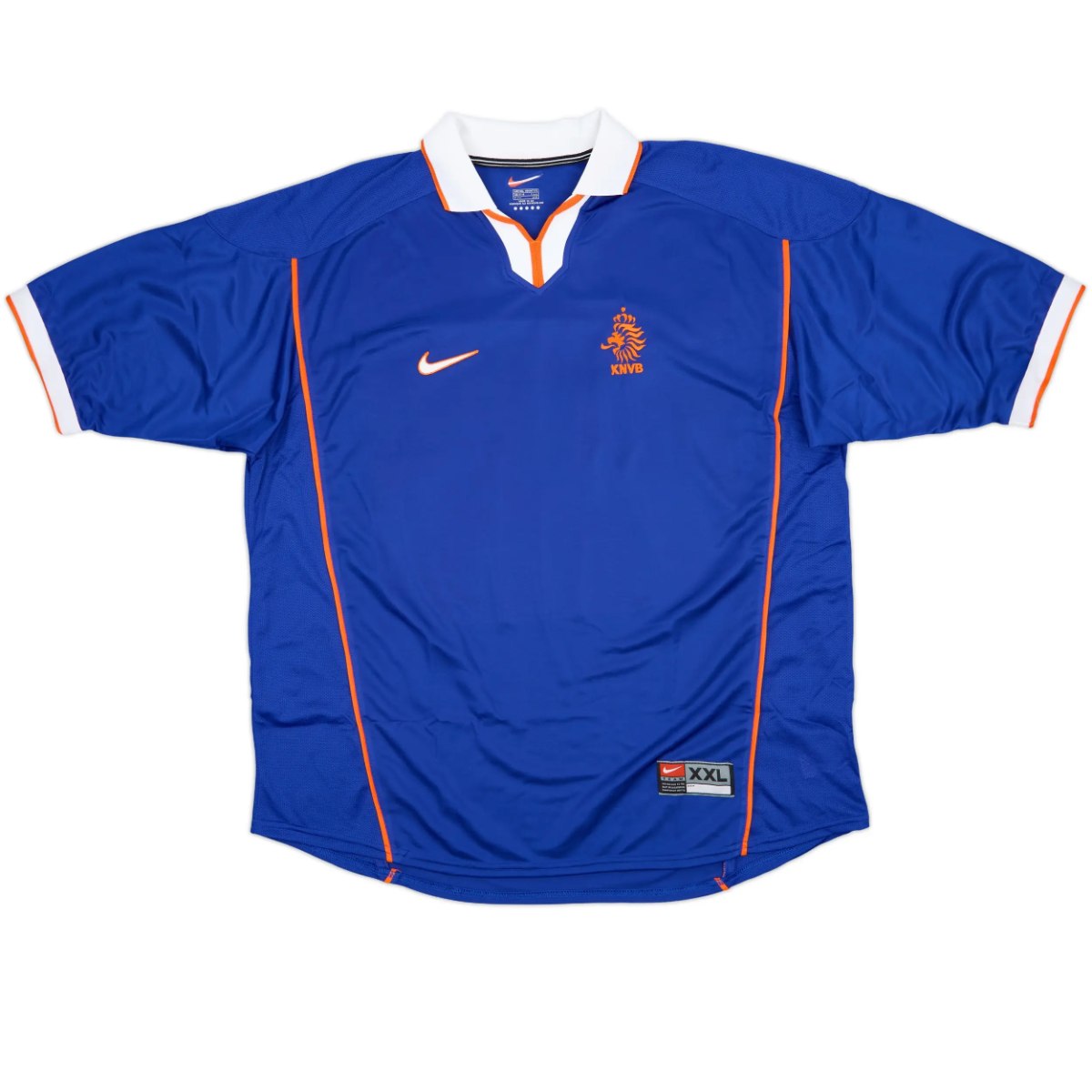 חולצת החוץ של הולנד מ-1998 מגיעה בגוון כחול כבסיס, עם שילוב כתום-לבן שמדגיש את הזהות ההולנדית גם מחוץ לכתום המסורתי. זה עיצוב “רגיל” שמדבר בעיקר דרך צבעים נקיים וקונטרסט ברור.