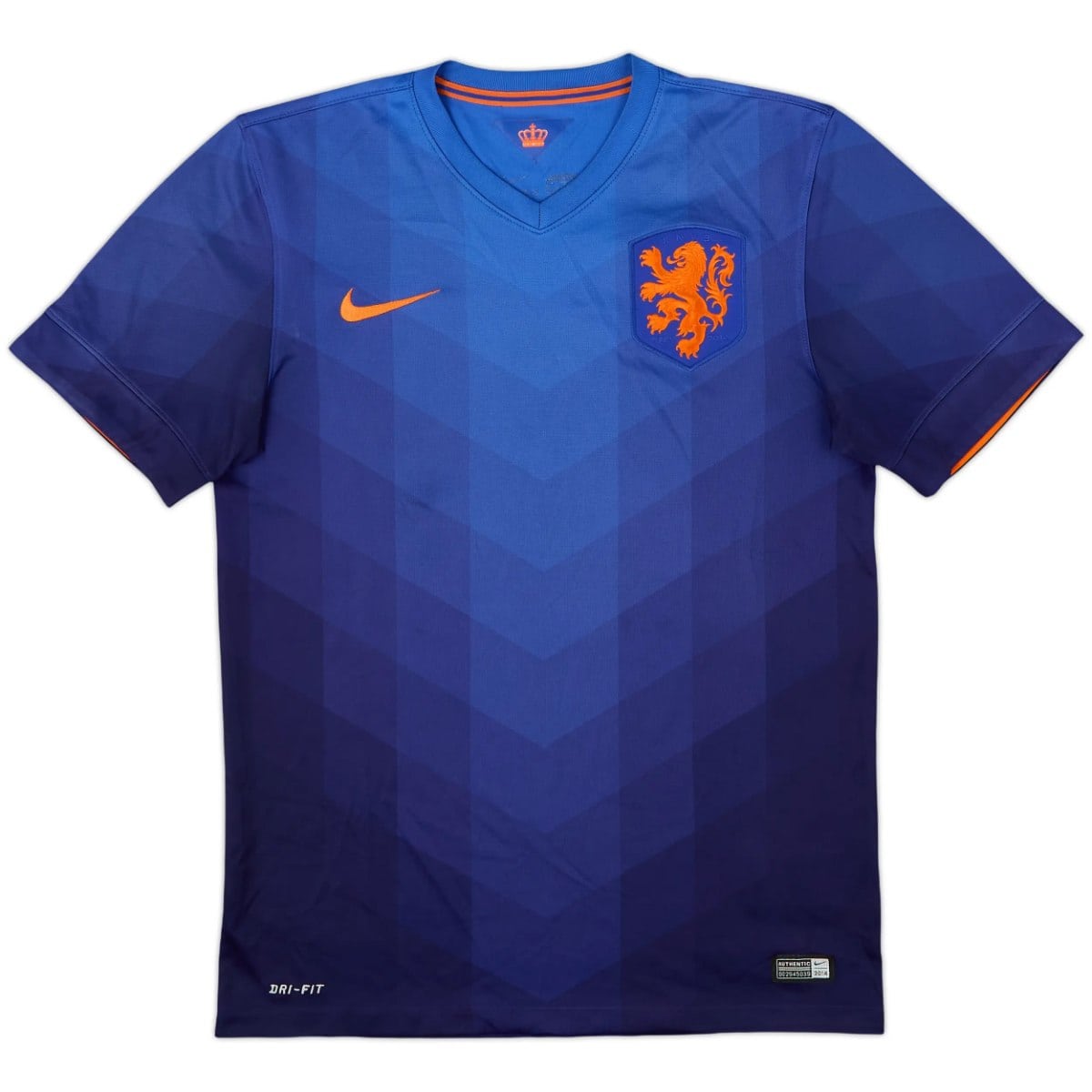חולצת החוץ רטרו של הולנד 2014 – כחול עם נוכחות כתומה עדינה מתקופת מונדיאל ברזיל. פריט חובה לאוהדי אורנז' ולאספני מונדיאלים.