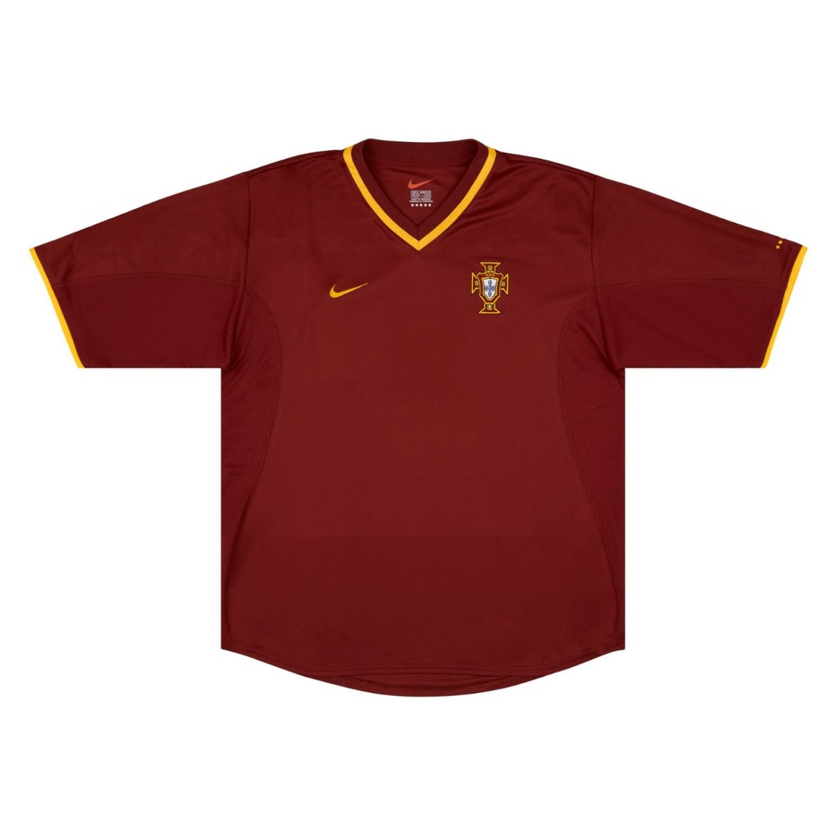 חולצת בית אדומה עם נגיעות זהב שמייצרות זיהוי מיידי עם פורטוגל. המראה נשאר נקי ומעודן – בדיוק הסגנון שהפך את חולצות תחילת שנות ה-2000 לפריטי רטרו שממשיכים לעבוד גם היום.