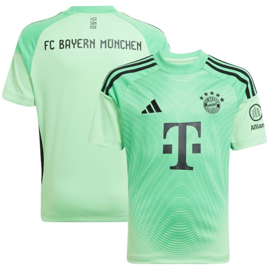 חולצת השוער של באיירן מינכן לעונת 2025/26, בעיצוב של Adidas, מציגה גישה נקייה ומודרנית עם שילוב של שני גוונים של ירוק בהיר.