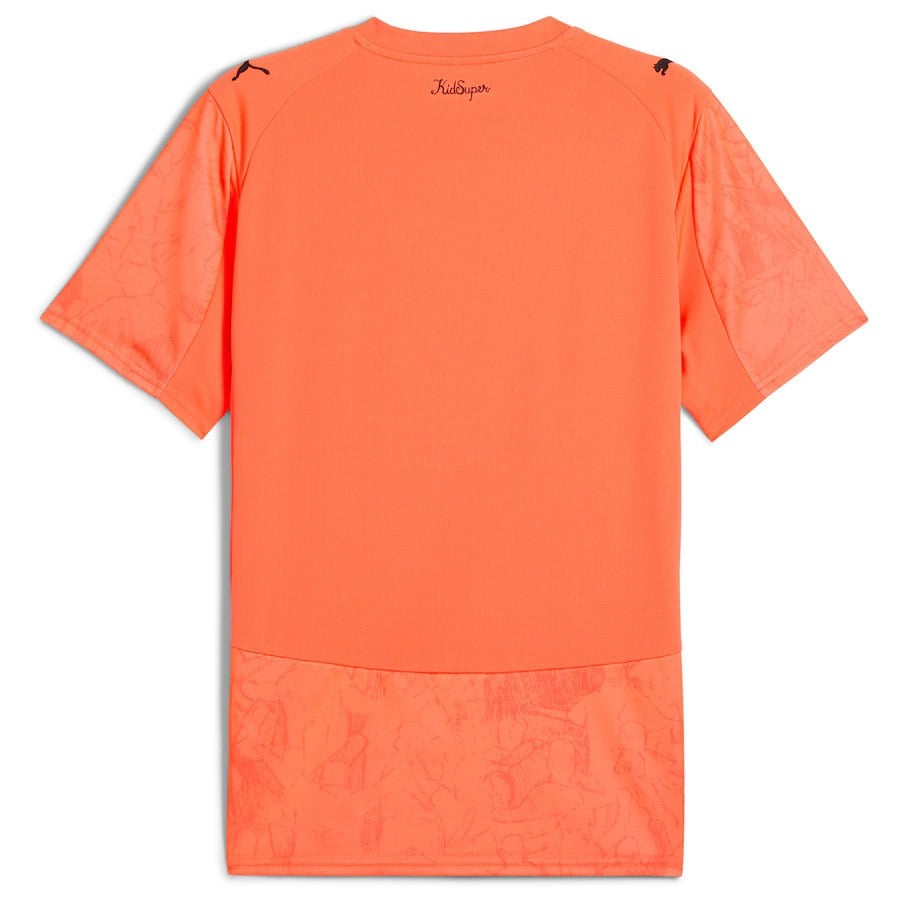חולצת שוער מיוחדת של מנצ’סטר סיטי לטורניר גביע העולם למועדונים 2025 מבית Puma ובשיתוף KidSuper, בצבע כתום ניאון (“Neon Sun”) עם סאש שחור וצהוב באלכסון על החזה – המשך ישיר לעיצוב הכנף באאוטפילדים . היא כוללת דוגמת “Poznań” עדינה ברקע – מחווה לחגיגת האוהדים – ומייצגת שילוב בין חזות דרמטית לבין נוחות: טכנולוגיית DryCELL, תפרים בעיצוב עורפי, ולוגואים רקומים של Puma ומנצ’סטר סיטי .