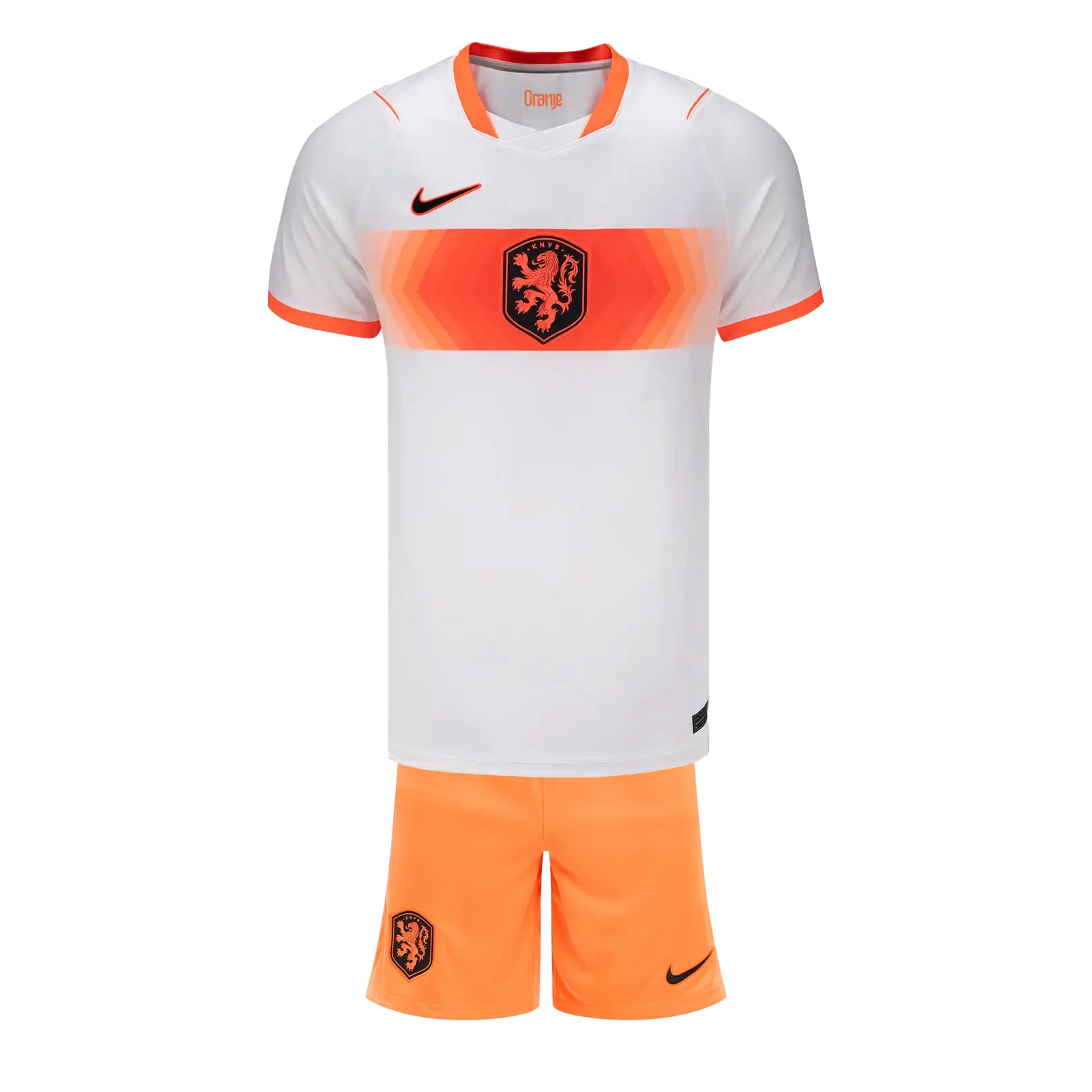 חליפת הילדים של הולנד חוץ מונדיאל 2026 בצבע לבן עם פס כתום, מספרי שחקנים ומידע על משחקי אורנג’ – סט מיוחד לאוהדים צעירים.