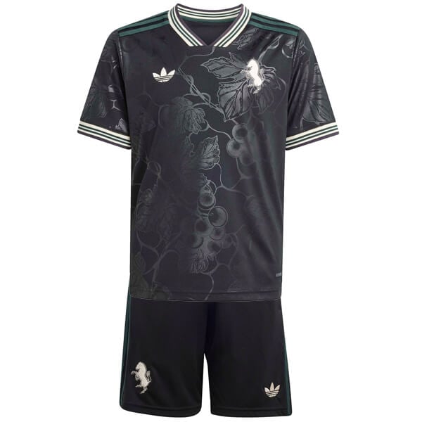 חליפת הילדים השלישית של יובנטוס 2025/26 בעיצוב כהה ויוקרתי עם דוגמת עלי גפן, מכנסיים שחורים ושמות שחקנים מובילים להדפסה.
