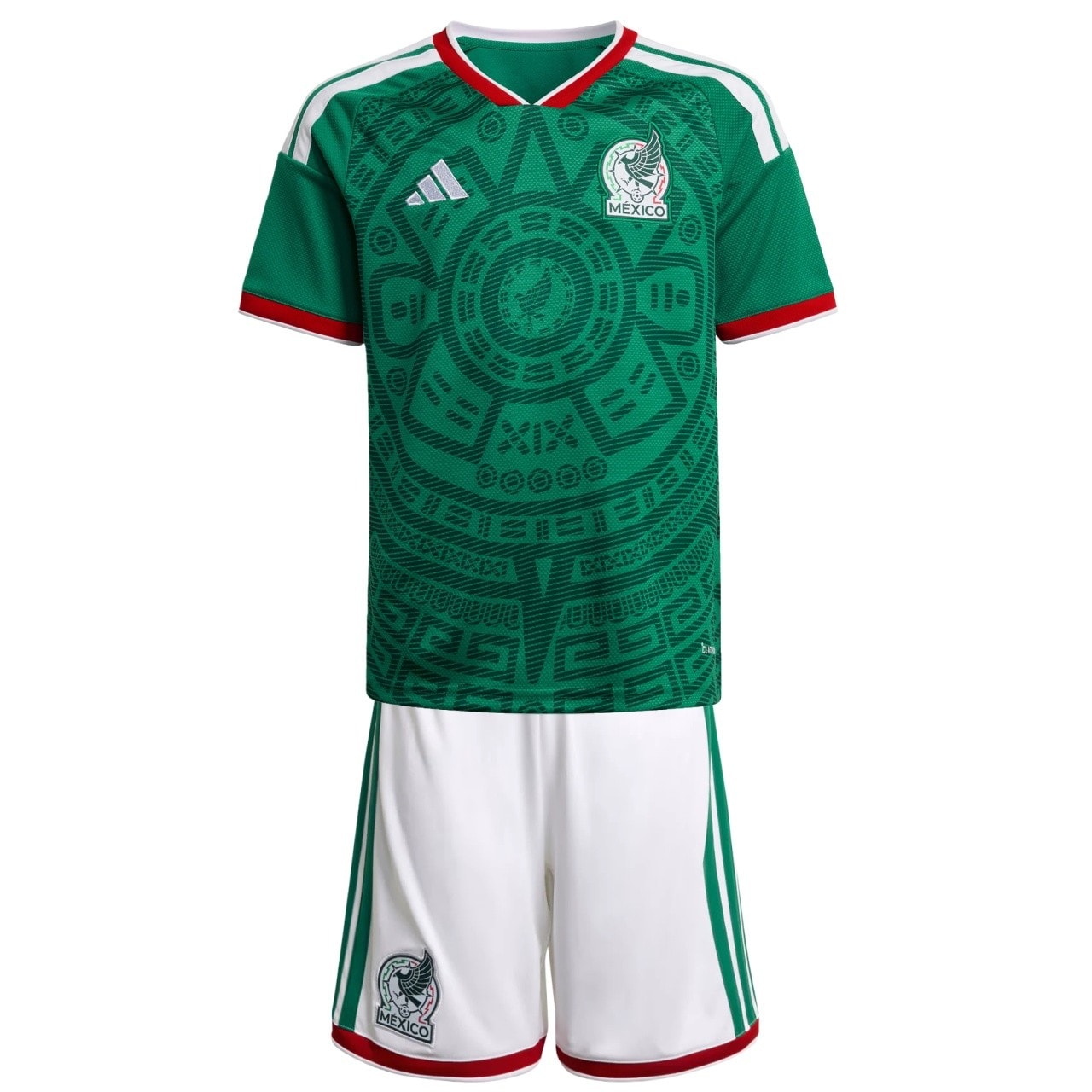 חליפת ילדים בית מקסיקו מונדיאל 2026 בצבע ירוק עם דוגמה אצטקית, סט מלא אופי עם אפשרות להדפס שחקנים מובילים של הנבחרת.