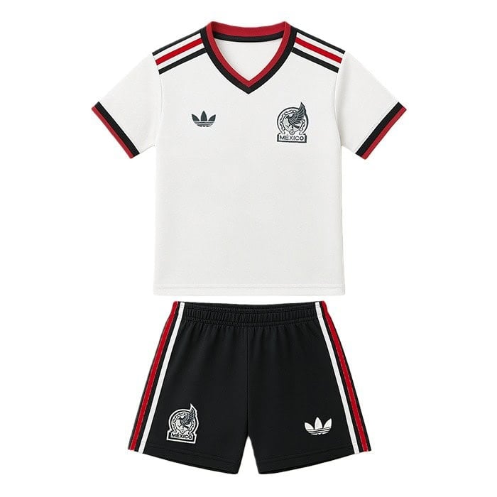 העיטורים בצבעי ירוק ואדום באזור הצווארון והשרוולים מוסיפים את החיבור המיידי לזהות של מקסיקו, והצווארון בצורת V נותן לכל הסט קו קצת יותר חד ובוגר. בגרסת הילדים זה עובד נהדר, כי התוצאה הסופית נראית חגיגית, כדורגלנית ומאוד מזוהה עם נבחרת שאוהדים אוהבים ללבוש גם מחוץ לימי משחק.
