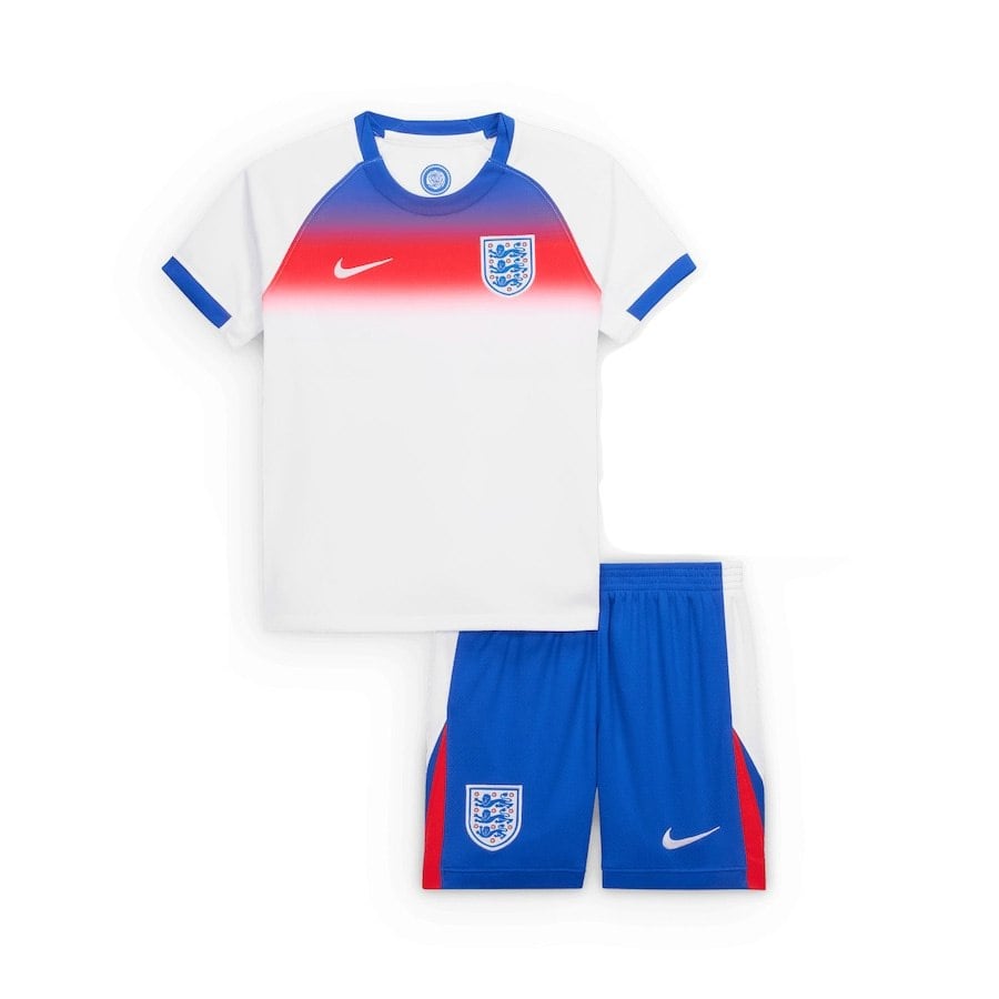 חולצת הבית החדשה של אנגליה לטורניר יורו 2025 מציגה עיצוב קלאסי על בסיס לבן, עם גרדיאנט ייחודי של כחול ואדום בחלק העליון. חולצה איכותית זו של נבחרת אנגליה עוצבה לנוחות וביצועים מרביים. סמל שלושת האריות האייקוני ממוקם בגאווה בחזית. התלבושת המלאה כוללת מכנסיים וגרביים תואמים, המשלימים מראה נקי ומלכותי. חולצת כדורגל איכותית זו של אנגליה אידיאלית לאצטדיון, לאימונים או ללבוש יומיומי.