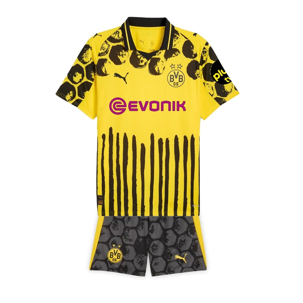 חולצת דורטמונד לטורניר גביע העולם למועדונים 2025, בשיתוף פעולה בין Puma למותג KidSuper, מביאה עיצוב נועז ומופשט בהשראת אמנות רחוב. החולצה בצבע צהוב עז, עם משיחות מכחול שחורות המדמות תנועה וחוסר סדר יצירתי. על הכתפיים מופיעה גרפיקה המזכירה מבנה כוורת – רפרנס לאוהדים ול"צהוב הדבש" של המועדון. סמל דורטמונד עם שני כוכבים מתנוסס על החזה, ובגב מופיע לוגו KidSuper. החולצה נלבשה לראשונה בטורניר שנערך בקיץ 2025.