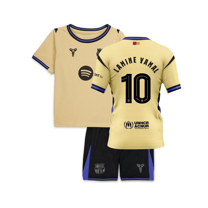 חולצת החוץ החדשה של ברצלונה לשנת 2025/26 מציגה עיצוב נועז על בסיס צהוב-זהב בהיר, עם הדגשים בצבעי שחור וסגול, בהשראת עולם הכדורסל. חולצה איכותית זו כוללת דפוס נחש עדין שמשולב בתוך סמל המועדון, כמחווה לכינוי "ממבה". התלבושת המלאה כוללת מכנסיים שחורים ופאנלים צדדיים בסגול, המשלימים מראה ייחודי ומרשים שמתאים באופן מושלם לסגנון המשחק החשמלי והנועז של לאמין ימאל.
