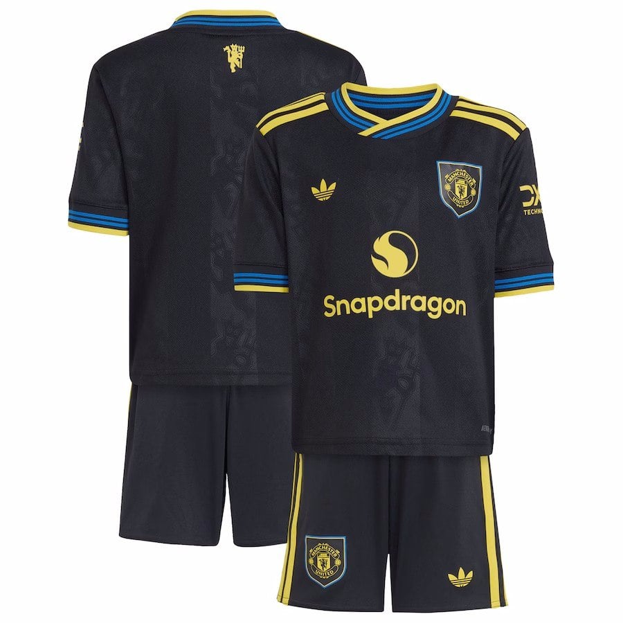 חליפת הילדים השלישית החדשה של מנצ'סטר יונייטד לעונת 25-26 מגיעה בבסיס שחור עם נגיעות של צהוב וכחול, ממש כמו במקור מלפני 30 שנה. החולצה כוללת פסים אנכיים המשלבים גימור מט ומבריק, ובתוך הפסים הכהים מוטבעים בעדינות סמלי השד האדום. את המראה משלימים לוגו התלתן (Trefoil) הקלאסי וגרסה מודרנית של סמל המועדון עם המגן.