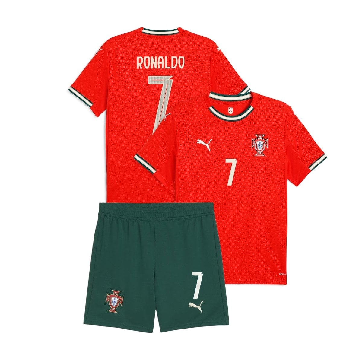 חולצת הבית הרשמית של נבחרת פורטוגל לשנת 2025, בעיצוב של פומה, מציגה מראה קלאסי ומכובד עם נגיעות מודרניות. הבסיס האדום ("Sport Red") נותר נאמן למסורת הפורטוגלית, אך הפעם משולב בגווני שמנת ("Sugared Almond") ליצירת ניגודיות אלגנטית.