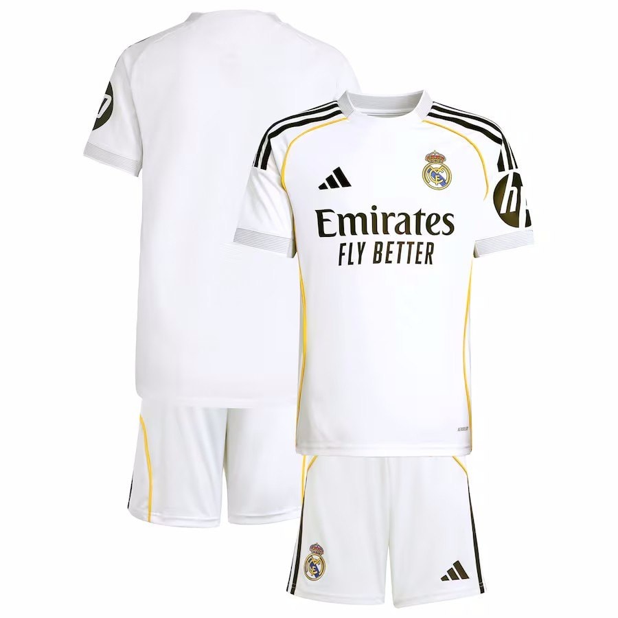 חולצת הבית של ריאל מדריד לעונת 2025/26, בעיצוב של Adidas, מציגה שילוב מרשים של אלגנטיות ומודרניות. החולצה בצבע לבן קלאסי, עם פסים שחורים על הכתפיים, קווים צהובים דקים בצידי החולצה ואלמנטים בגוון אפור בהיר. לוגו המועדון רקום בצד שמאל של החזה, ולוגו Adidas בצד ימין. הספונסרים, "Emirates" בחזית ו-HP על השרוול, מופיעים בצבע חום, מה שמוסיף נופך יוקרתי לעיצוב. החולצה עשויה מבד AEROREADY של Adidas, המסייע בנידוף זיעה ושמירה על נוחות מרבית במהלך המשחק.