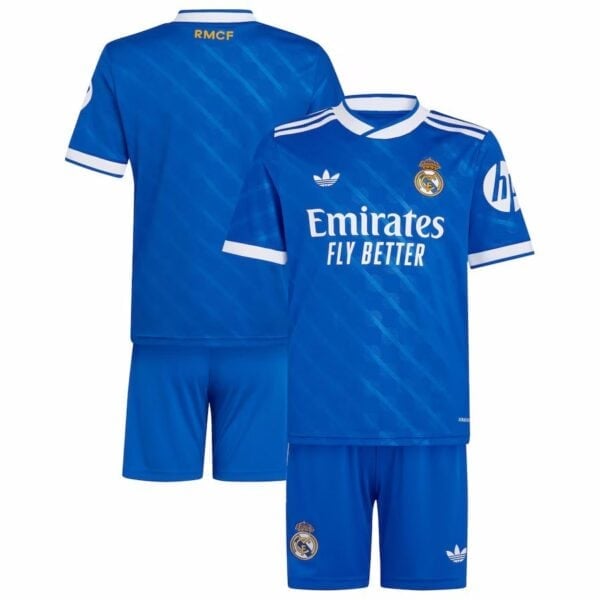 חליפת הילדים השלישית החדשה של ריאל מדריד לעונת 25-26 מגיעה בצבע כחול 'Bluebird' דומיננטי, עם סמלים לבנים. החולצה כוללת דפוס בד ייחודי בהשראת המושבים באצטדיון הברנבאו, עם שלושה פסי זיגזג. התלבושת המלאה כוללת מכנסיים וגרביים כחולים למראה מושלם.