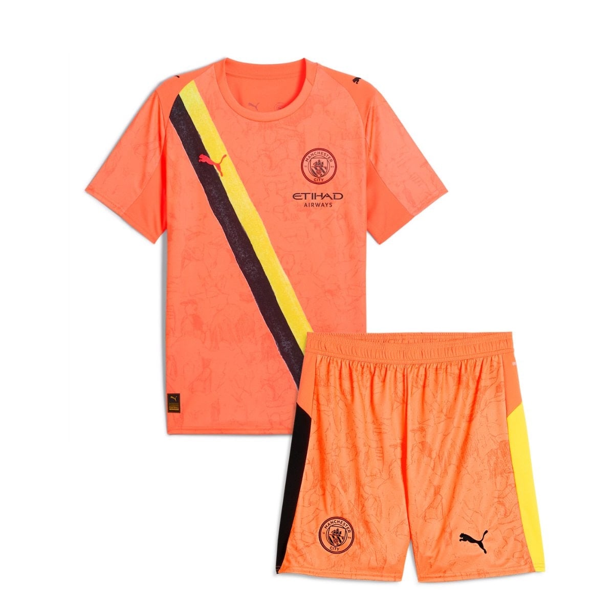 חולצת שוער מיוחדת של מנצ’סטר סיטי לטורניר גביע העולם למועדונים 2025 מבית Puma ובשיתוף KidSuper, בצבע כתום ניאון (“Neon Sun”) עם סאש שחור וצהוב באלכסון על החזה – המשך ישיר לעיצוב הכנף באאוטפילדים . היא כוללת דוגמת “Poznań” עדינה ברקע – מחווה לחגיגת האוהדים – ומייצגת שילוב בין חזות דרמטית לבין נוחות: טכנולוגיית DryCELL, תפרים בעיצוב עורפי, ולוגואים רקומים של Puma ומנצ’סטר סיטי .
